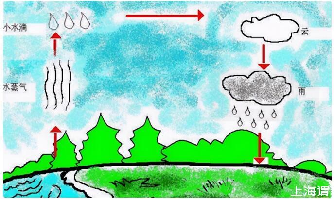水(蒸发)→水蒸气(上升)→小水滴(凝固)→大水滴·云(溶合)→雨(下降)