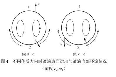 传质方向对分散相滞存率的影响是由于Marangoni效应影响液滴破碎和聚并引起的。图2和图3中传质方向为d→c的分散相滞存率远高于传质方向c→d的,原因在于本实验所用的正丁醇-丁二酸-水体系是界面张力随浓度增加而减小的体系(即∂γ/∂c<0)。在∂γ/∂c<0体系的d→c传质过程中[如图4(a)所示],界面张力梯度导致液滴表面的运动方向与液滴内部环流方向相同,有利于液滴的破碎。而c→d的传质过程[如图4(b)所示],界面张力梯度的方向不变,但液滴内部环流方向却恰好相反,内部与外部两种力量相互抵消,液滴相对较稳定,破碎的概率大大减小。所以,d→c的分散相滞存率明显高于相反方向。