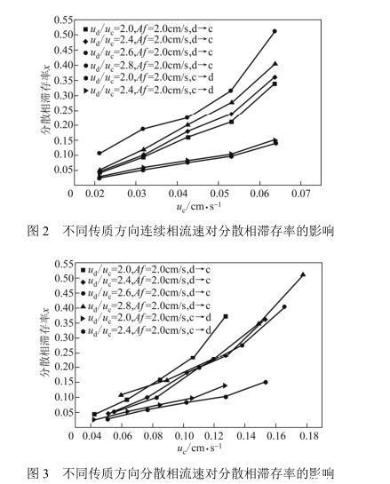 图5是筛板在不同振动速率下的分散相滞存率变化情况。图中结果显示:分散相滞存率随着筛板振动速率Af的增加而增大。振动的筛板对液滴有强烈的剪切作用,加速了液滴破碎、聚并和再破碎过程,固分散相滞存率随Af增大。
