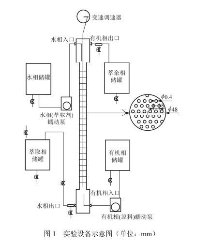 水相和有机相分别通过可调节流速的蠕动泵进入塔内,两相在塔内实现逆流接触传质后分别从塔底和塔顶的出口流出进入各自储罐。实验中溶质丁二酸从有机相向水相传递,有机相和水相分别作分散相,以此来考察溶质从分散相到连续相(d→c)和从连续相到分散相(c→d)不同传质方向对萃取效果的影响。