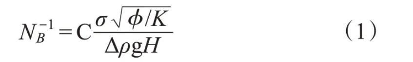 NB-1为渗吸机理判别参数,式中没有考虑岩石润湿性。NB-1>5时,毛管力在渗吸作用中起主导作用;1<NB-1<5时,重力和毛管力同时起作用;NB-1<<1时,重力起主导作用。
