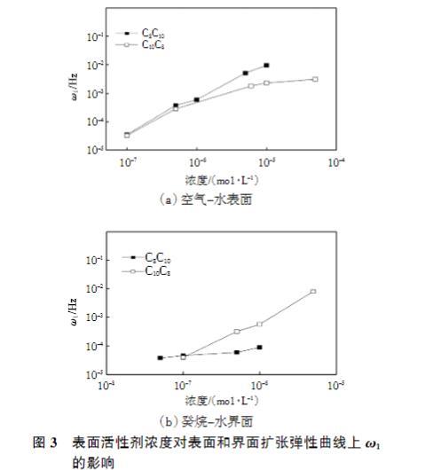 表面活性剂浓度对表面和界面扩张弹性全频率谱上ω1的影响如图3所示。