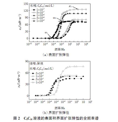 图2 C8C10溶液的表面和界面扩张弹性的全频率谱