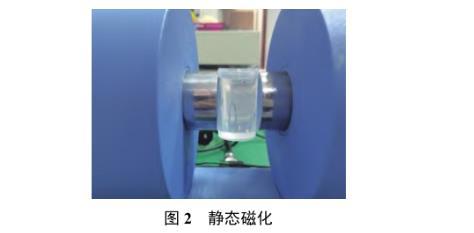 Esmaeilnezhad等研究表明,水溶液表面张力随液体温度的升高逐渐减小,因此在试验过程中保持试验环境温度为26℃。按照除草剂与自来水1∶300的体积比配置异丙甲草胺除草剂溶液。设定最短磁化时间为5.0 min,最长磁化时间为25.0 min,以5 min为公差进行递增磁化,实际磁化时长可根据试验结果进行细化调整,试验中实际磁化时长见表1,试验共分11组处理,处理1为对照组,处理2~11为试验组,共48组试验,每组试验重复4次。处理1用塑料烧杯量取40 mL溶液,使用蜜桃AV免费观看(图1)按照仪器使用方法测未磁化状态下溶液的表面张力,测试结果显示在仪器屏幕上,为保证数据准确性,重复测3次取平均值,为63.5 mN/m,当作对照值。处理2~11均使用静态磁化处理,以处理2为例,调整程控功率电流源使两磁极间磁场强度为50 mT,量取40 mL溶液置于塑料烧杯中,将烧杯夹紧于双轭双调气隙电磁铁两磁极中间进行磁化处理,如图2所示。磁化水表面张力状态约能保持25 min,为确保所有试验组各变量一致,磁化完毕后立即用蜜桃AV免费观看测试溶液表面张力并记录数据。之后每个处理的磁场强度递增50 mT,且各处理的操作步骤参照处理2进行。