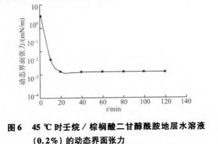 图6 45℃时壬烷/棕榈酸二甘醇酰胺地层水溶液(0.2%)的动态界面张力
