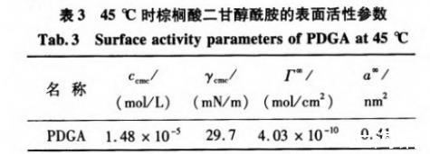 表3 45℃时棕榈酸二甘醇酰胺的表面活性参数