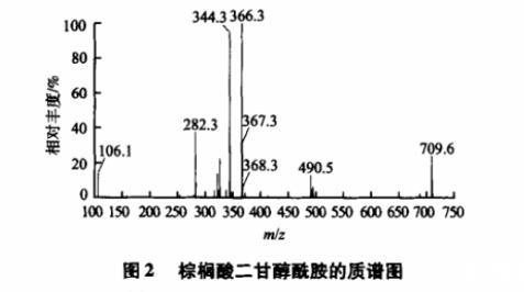 2.2.2质谱分析图2为棕榈酸二甘醇酰胺的质谱图(正电荷模式)。