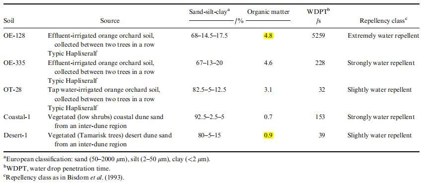 来自以色列不同地区的五种防水土壤 过筛(1 毫米)并在室温下储存在玻璃容器中 实验室条件(平均温度 ¼ 24.5°C,平均 相对湿度 (RH) ¼ 65%)。 两种土壤 (OE-128 和 OE-335; 典型的单氟草胺)是从相同的 污水灌溉的商业柑橘园与以前一样 研究(Wallach 等人,2005 年;Graber 等人,2006 年)位于 以色列沿海平原的中部(31°59¢30.56²)。 一 土壤(OT-28;典型单头草)是从水龙头中获得的 同一商业果园的水灌溉柑橘地块。 一种 沙丘沙是从附近的沙丘间地区获得的 位于地中海的尼察尼姆自然保护区 (31°16¢37.24²) 海(Coastal-1)和来自沙间地区的粘土砂 内盖夫北部沙漠 (30°52¢02.59²; (Desert-1) 的 Halutza 附近。表 1 列出了显着的土壤特征。
