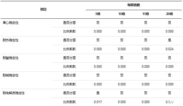 1)经过稀释后,耐热稳定性、耐电解质稳定性两个测试项目虽然出现分层情况,但是比例系数均在0.1以下,氨基改性硅油柔软剂保持较好的稳定性;