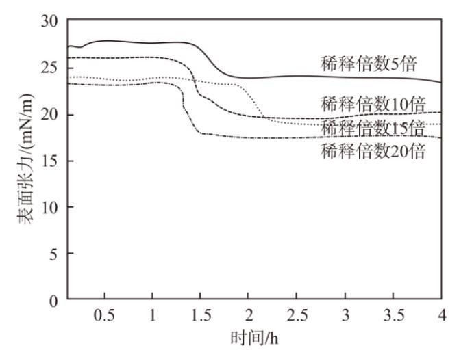 2)随着稀释倍数提高,氨基改性硅油柔软剂的表面张力越来越小,基本维持在一定的水平上,说明氨基改性硅油柔软剂表面张力稳定性较好,并不会受到稀释程度较大的影响;