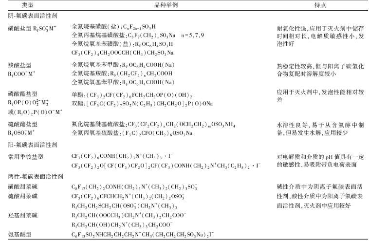 通过将短链氟碳表面活性剂进行优选和整理,可以清晰地看出,目前有四种类型:①短链阴-氟碳表面活性剂常以磺酸盐和羧酸盐为合成原料,这是由于两者本身就具有良好的稳定性和亲水性,引入氟原子后可以使其发挥出更大的性能优势;②短链阳-氟碳型化合物的制备原料多为全氟季铵盐类,它可以不受pH值影响,且与其他碳氢化合物的复配协同性较好,非常具有工业应用的价值;③短链两性-氟碳型化合物中,甜菜碱类型比常规碳氢化合物的活性更高,同时它的宽等电点也在一定程度上增加了它的pH适用范围,且应用成本不高,生物降解性好,所以同样具有很大商业开发价值;④短链非离子-氟碳表面活性剂在水溶液中为非离子状态,故稳定性高,不受pH值影响,可适应强酸碱性的环境,并且与碳氢化合物复配后的协调性良好。但当前所报道的非-氟碳表面活性剂多为长链结构,不利于环境的可持续发展,建议应加快短链结构研发和应用的研究步伐。各种离子类型氟碳表面活性剂及其特性见表1。