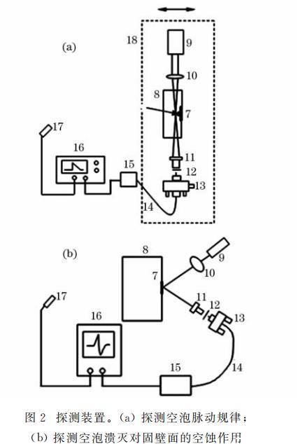 图2探测装置。(a)探测空泡脉动规律;(b)探测空泡溃灭对固壁面的空蚀作用