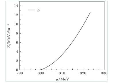 利用薄壁近似,图2给出了当T=Tc时,夸克强子一级相变的表面张力随夸克化学势的变化。可知在一级相变区域,当化学势增大时,强子相的表面张力也随着化学势增大。当温度接近零时,强子夸克相变的表面张力约为12.6 MeV/fm2.在T→0的情况,本文理论预言与文献一致,但该文献只是考虑T=0的冷夸克物质的夸克强子一级相变。