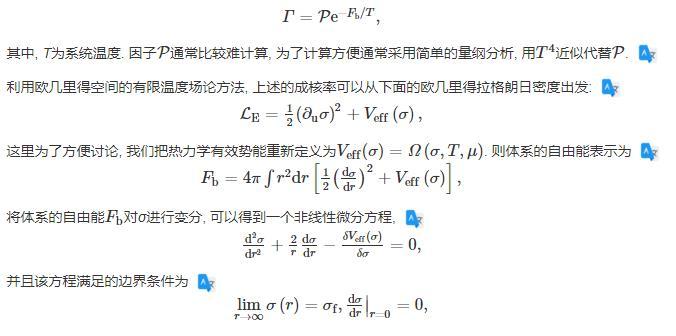 在伪真空的环境下,大小不一的真真空泡泡,由于量子涨落和热涨落随机出现并消失,直至泡泡的半径大于等于临界半径,然后这些泡泡就会一直膨胀下去,完成一级相变的相变过程,并把多余的体系自由能以相变潜热的形式释放到环境中。基于这个机制,单位时间单位体积的临界泡泡成核率可以表示为