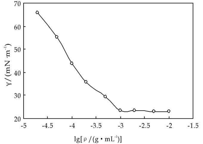 由图2可看出,曲线转折点对应FSS的lgρ=-3.0,即ρ=1×10-3g·mL-1或1.0 g·L-1,故其临界胶束浓度(cmc)为1.0 g·L-1,此时表面张力(γcmc)为23.5 mN·m-1.由此可见,合成的FSS能使水的表面张力由约72 mN·m-1降至23.5 mN·m-1,说明该表面活性剂表面活性优良。