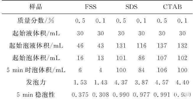 表1 FSS与SDS、CTAB的发泡力和稳泡性比较
