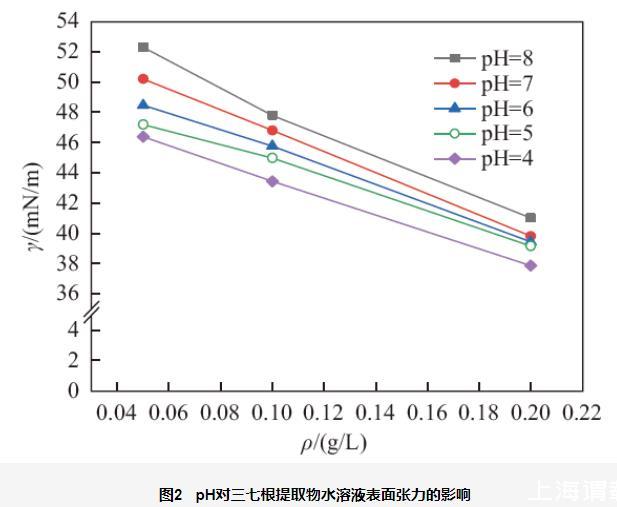 将0.05,0.1和0.2 g/L的三七根提取物水溶液分别调节至pH为4.0~8.0,并测量其表面张力,结果如图2所示。同一质量浓度下三七根提取物的表面张力随pH的降低而降低,这可能是因为三七根提取物中的皂苷含有羧基等弱酸性官能团,因此在酸性条件下皂苷的表面活性不会被破坏。