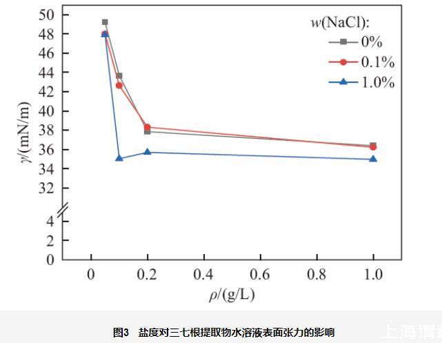 分别配制含NaCl质量分数为0%,0.1%和1.0%,三七根提取物质量浓度为0.05,0.1,0.2和1.0 g/L的水溶液,测量其表面张力,结果如图3所示。相同质量浓度下的三七根提取物水溶液,表面张力随NaCl含量的增加而降低,cmc也有所下降。这表明随NaCl的增加,三七根提取物降低表面活性的能力及效率都有所增加,可能是由于NaCl的水化作用较强,竞争三七根提取物极性基团附近的水化水,使其疏水作用增强,在界面易于排列形成更紧密的界面膜,有利于胶束形成,从而降低表面张力和cmc。