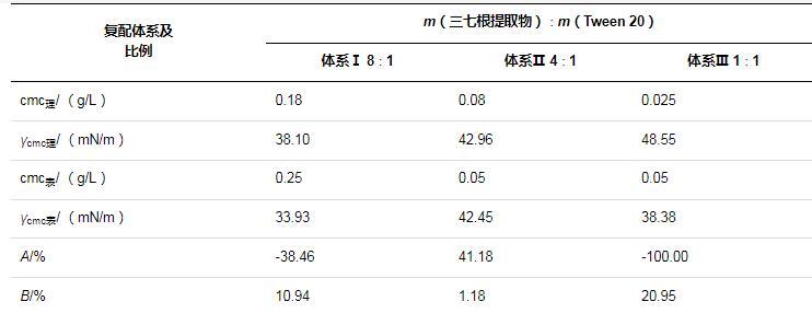 根据Rosen相分离模型,当二元混合表面活性剂复配体系在吸附达到平衡时,溶液相与表面相的化学势能相等(μ溶=μ表),从吸附达到饱和时溶液相与表面相、胶束相的化学势能相等(μ溶=μ表=μ胶)出发,推导出复配增效的最佳质量比值约等于各单一组分临界胶束浓度的比值,即m1∶m2≈cmc1∶cmc2。根据之前的实验结果,近似地将三七根提取物与Tween 20的复配质量比定为4∶1。