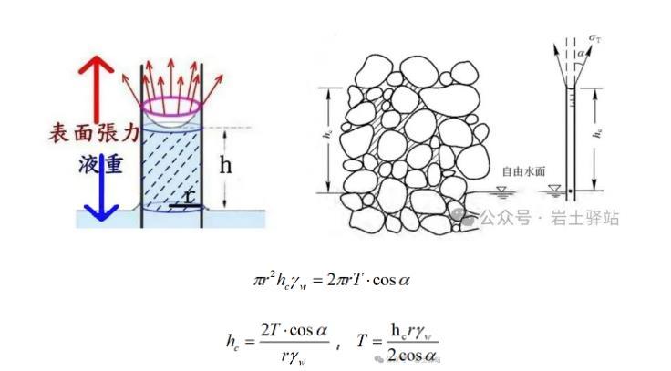 来自《土力学》式中,水膜张力T与温度有关,单位:N/cm或KN/m;10°时,T=7.41×10-4N/cm=7.41×10-5KN/m;方向与毛细管成夹角α,该角度的大小与土颗粒矿物成分和水性质有关;