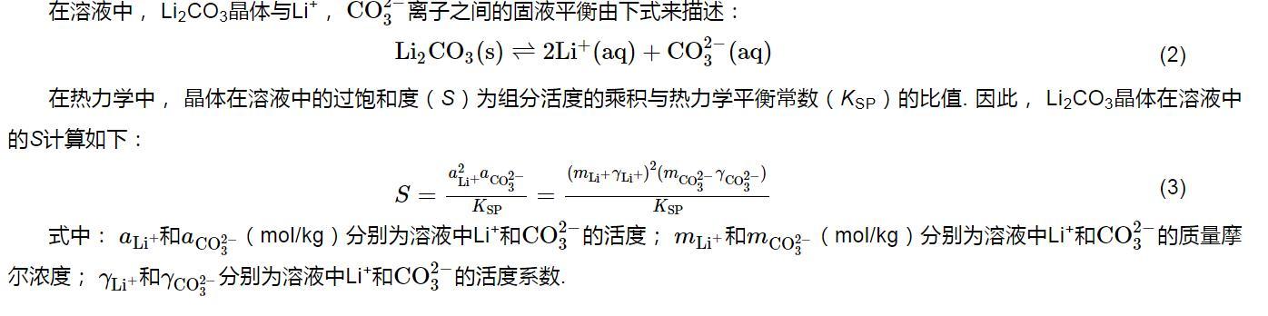 在热力学中,晶体在溶液中的过饱和度(S)为组分活度的乘积与热力学平衡常数(KSP)的比值.因此,Li2CO3晶体在溶液中的S计算如下: