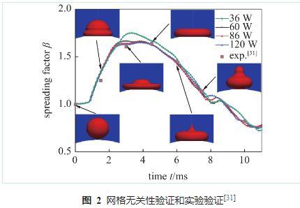 为了定量分析网格数量对数值模拟结果准确性的影响,以液滴撞击壁面时的铺展因子作为定量分析指标及网格无关性验证的评判标准。网格数量从36 w开始增加,每次增长大约30 w,并绘制液滴铺展因子β随时间变化与网格数量的关系图。如图2所示,网格数在86 w以上时基本不会对模拟结果产生影响,为保证模拟精度并确保求解时间,本文采用86 w网格数作为模型的基准网格数进行模拟。从图中也可以看出,数值模拟结果与参考文献中的实验结果趋于一致,说明本文采用的模型可以用于研究液滴撞击球面的Leidenfrost现象。