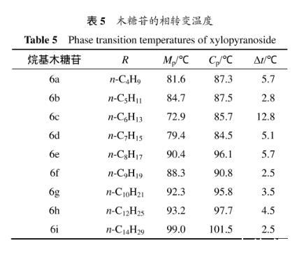 具有液晶特征的化合物因加热而呈现所谓的“双熔融转变”的相变现象,当加热达到其熔点(p)时,结晶性的固态首先转变成半透明的液晶态,接着在较高的温度(p)下转变成各向同性的清亮的液态。表5所示为木糖苷的相转变温度。从表5可见:烷基-β-D-吡喃木糖苷属于一头一尾(one head one tail)或一头组一链(one head group-one chain)且呈现多态性的双亲吡喃糖苷分子,在加热时其相变发生在相对较小的温度区间,但都出现了液晶相,且当疏水性烷基碳链长度为6时,烷基-β-D-吡喃木糖苷相变温度之差(Δ)较大,其他的都比较接近。在木糖苷中,烷基有助于提升分子取向的稳定性,且这种稳定性对液晶相的生成是必要的。但由于烷基-β-D-吡喃木糖苷为环状的糖苷只有3个游离羟基,比烷基--D-吡喃葡萄糖苷少了亲水性头部的糖环上的羟甲基,也比木糖醇的十二烷基单醚少了1个游离的羟基,清亮点p不高,所以,得到的烷基-β-D-吡喃木糖苷具有液晶相,但相变温度范围(∆=p−p)较窄,液晶相的稳定性较弱。
