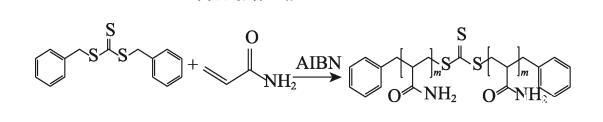 在500 mL四口烧瓶中加入200 g无水乙醇、10 g(0.14 mol)AM和一定量DBTTC〔其中,n(AM)∶n(DBTTC)=100∶1、200∶1、300∶1、500∶1、700∶1、1000∶1〕,超声混合均匀后再加入0.0231 g(0.14 mmol)AIBN,然后在70℃下反应8 h。反应结束后,趁热出料,过滤。在超声条件下,用正己烷洗涤沉淀,过滤,重复数次,除去未反应完全的反应物,在45℃下真空干燥24 h,得到淡黄色的PAM-CTA固体粉末。将上述不同n(AM)∶n(DBTTC)制得的产物依次命名为PAM-CTA-1、PAM-CTA-2、PAM-CTA-3、PAM-CTA-4、PAM-CTA-5、PAM-CTA-6。