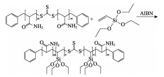 在500 mL四口烧瓶中加入300 g无水乙醇、0.0231 g(0.14 mmol)AIBN和10.0816 g(0.28 mmol)PAM-CTA-4,用超声波将PAM-CTA-4混合均匀分散,再加入VTES〔其中,n(VTES)∶n(AM)=5∶100、10∶100、15∶100、20∶100〕,在70℃下反应8 h。反应结束后趁热出料,过滤。在超声条件下,用正己烷洗涤沉淀,过滤,重复数次,在45℃真空干燥24 h,得到PAM-b-PVTES固体粉末。将上述不同n(VTES)∶n(AM)制得的产物依次命名为PAM-b-PVTES-1、PAM-b-PVTES-2、PAM-b-PVTES-3、PAM-b-PVTES-4。