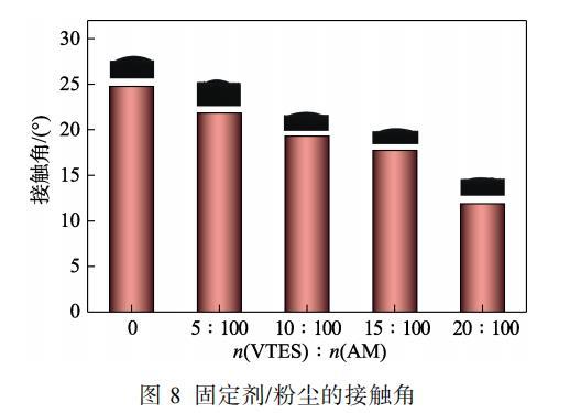 由图8可知,共聚物水溶液与PTI-A2粉尘的接触角均<90°,随着VTES用量的增大,固定剂与PTI-A2粉尘片的接触角逐渐减小。当n(VTES)∶n(AM)由0增加到20∶100时,接触角从24.8°降低至11.9°,主要是因为VTES用量的增加赋予了共聚物水溶液更低的表面张力,而PTI-A2粉尘具有较高的表面张力,因而接触角越来越小。固定剂与粉尘片的接触角越小,表明固定剂能更好地润湿气溶胶粉尘颗粒,在空气中固定剂与气溶胶粉尘颗粒能更好地粘附。