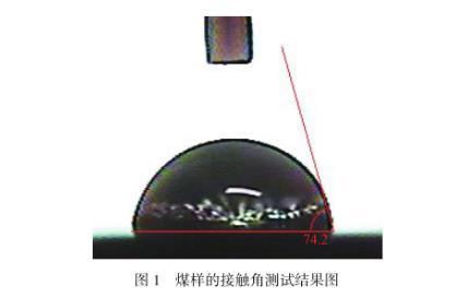 图1为本实验所选煤样的接触角测试结果图,由图可以看出,煤样的接触角为74.2°,相较于其他类型的煤(接触角为20.55°,22.34°,34.23°和29.75°),其接触角明显偏大,具有较强的疏水性。
