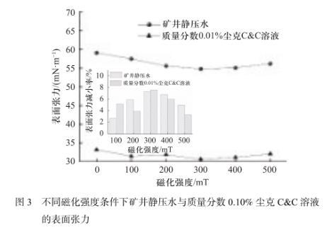 图3不同磁化强度条件下矿井静压水与质量分数0.10%尘克C&C溶液的表面张力
