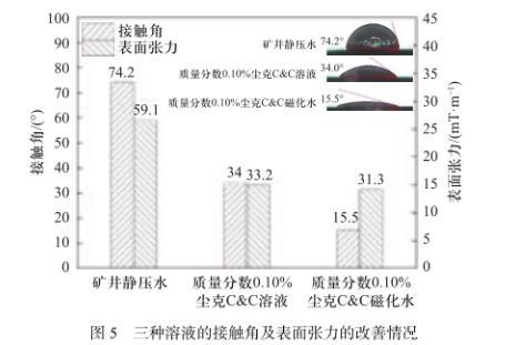 矿井静压水,质量分数0.10%尘克C&C溶液,质量分数0.10%尘克C&C磁化水的铺展功分别为~42.97,~5.67,~1.14 mN/m.由图6(b)可以看出,添加尘克C&C试剂和对溶液磁化,均可以提升溶液的铺展功。相较于矿井静压水,质量分数0.10%尘克C&C磁化水的铺展功最大,提升了97.35%,更趋近于0,更容易在低水分无烟煤颗粒表面铺展。