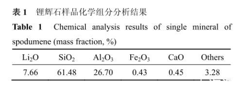 本试验所用的锂辉石来自四川某锂辉石矿,试验矿样分别经过手选、刚玉破碎机破碎、清洗、瓷球罐研磨、筛分出0.038~0.074 mm和<0.038 mm两个粒级的锂辉石分别作为分析测试和单矿物浮选试验的样品,其化学组成分析(XRF)结果如表1所列。