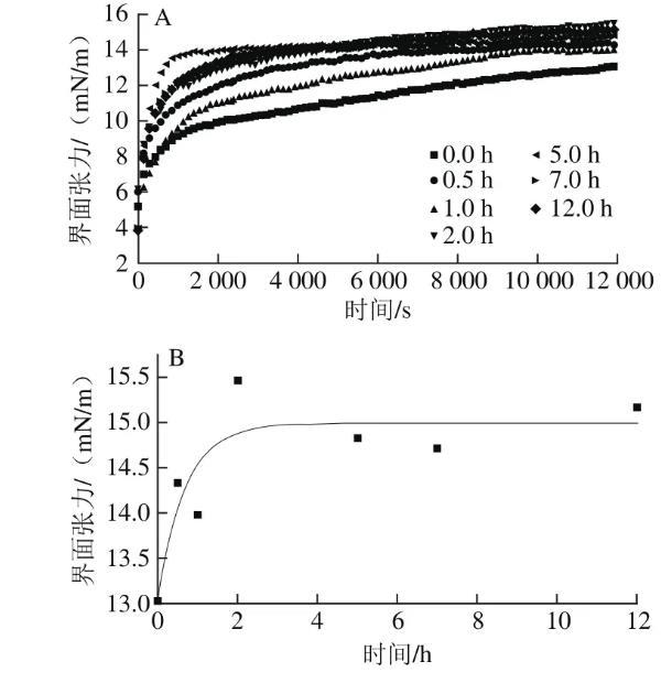 图3纤维化过程中β-乳球蛋白在油水界面的吸附动力学过程(A)及其饱和界面张力(B)的变化