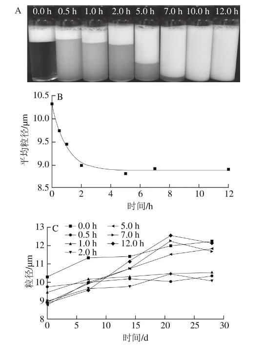 图5纤维化转变过程中β-乳球蛋白纳米纤维稳定的乳液外观(A)、平均粒径(B)和常温贮藏时粒径(C)的变化