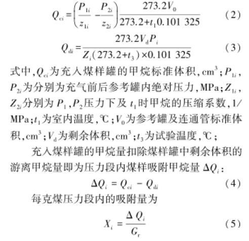 充入煤样罐的甲烷量扣除煤样罐中剩余体积的游离甲烷量即为压力段内煤样吸附甲烷量ΔQi: