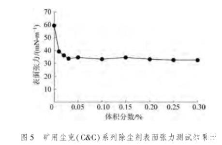 为了确定合理的表面活性剂添加浓度,分别选取了体积分数为0.01%,0.02%,0.03%,0.05%,0.1%,0.15%,0.2%,0.25%,0.3%的矿用尘克(C&C)系列除尘剂进行溶液表面张力测试,溶剂选用矿井水,测试仪器选用芬兰Kibron EZ-Pi Plus便携式动态蜜桃AV免费观看,采用最大拉力法记录圆环薄膜的拉伸破坏情况,从而计算出液体的表面张力。液滴表面张力越小,其与粉尘接触后,更容易黏结沉降。测试结果如图5所示。