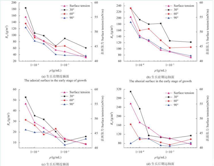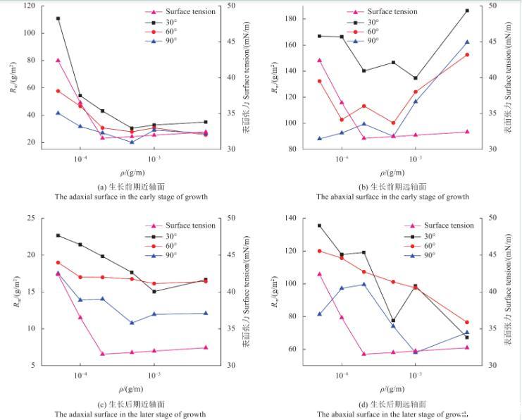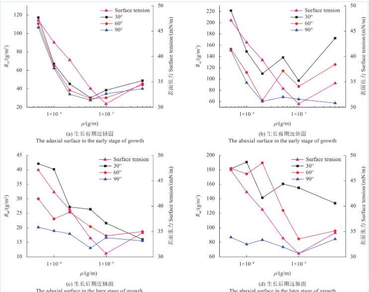 图6为不同浓度SilwetL-77溶液在苹果叶片近、远轴面的Rm变化规律。由图可知,当溶液质量浓度低于cmc时,苹果叶片生长前、后期远轴面的Rm值和表面张力均随溶液质量浓度的降低而减小。此外,苹果叶片生长后期近轴面只有在30°倾角时的Rm值与表面张力随溶液质量浓度的提高而减小,60°倾角和90°倾角时Rm值随溶液浓度变化不大。苹果叶片生长后期远轴面Rm值和表面张力随溶液浓度的变化与生长前期基本一致。