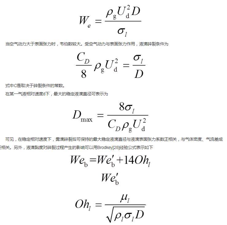 当空气动力大于表面张力时,韦伯数较大。受空气动力与表面张力作用,液滴碎裂条件为