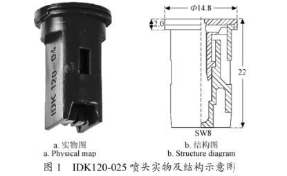 试验喷头为德国LECHLER公司生产的空气诱导喷头IDK120-025和多量程平面喷头LU120-015,其结构及尺寸如图1和图2所示。