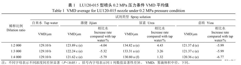 该试验条件下雾滴体积中径试验结果如表1所示。由表1可知,与自来水相比,激健与意欧均使雾滴粒径减小,而尿素溶液呈增大雾滴粒径的趋势。