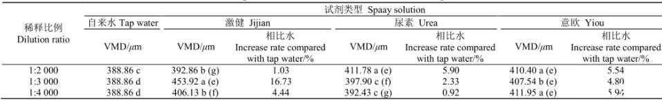 注:数字后不同字母表示同1行不同溶液间差异显著(<0.05),括号内字母表示同1列数值显著性差异(<0.05)。VMD:雾滴体积中径。下同。