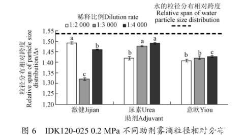 此试验条件下自来水的粒径相对分布跨度为1.544。3种助剂溶液雾滴粒径相对分布跨度Δ受溶液配比因素影响程度不同。激健溶液1:3 000配比条件下对雾滴粒径相对分布跨度影响最为显著,为1.320,与水相比减小14.50%,明显优于该条件下其他各组数据。与尿素相比,意欧助剂在各浓度比例下对雾滴粒径相对分布影响保持在降低8%左右,改善效果更优,且受浓度变化影响小。