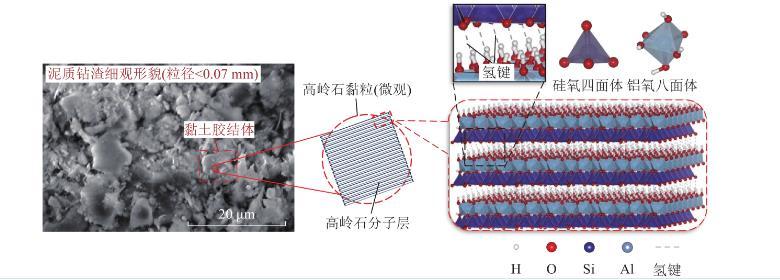图2中,在微观尺度层面,由于高岭石形成过程中发生同晶置换,使晶层表面带永久负电荷。当高岭石黏粒遇水时,水分子的偶极性使氢原子易与高岭石晶层表面电负性较强的氧原子结合形成氢键,同时,吸附在晶层表面的水分子之间也会通过氢键连接,该过程即为水分子的吸附过程。当第1层水分子被高岭石黏粒吸附后,其外侧氧原子呈负电性,继续与第2层水分子的氢原子以氢键形式结合,最终形成多层水分子“水膜”。高岭石黏粒不断吸水扩层,使钻渣颗粒体积不断膨胀,同时伴随钻渣内部非泥质矿物的溶解,高岭石黏粒间距变小,并通过外侧“水膜”相互吸附,构成“水桥”,使得多个高岭石黏粒能够在遇水后聚集,形成更大的团聚体。
