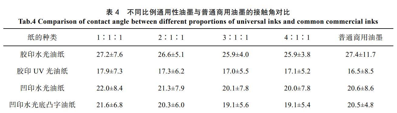 表4不同比例通用性油墨与普通商用油墨的接触角对比
