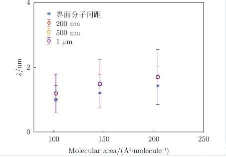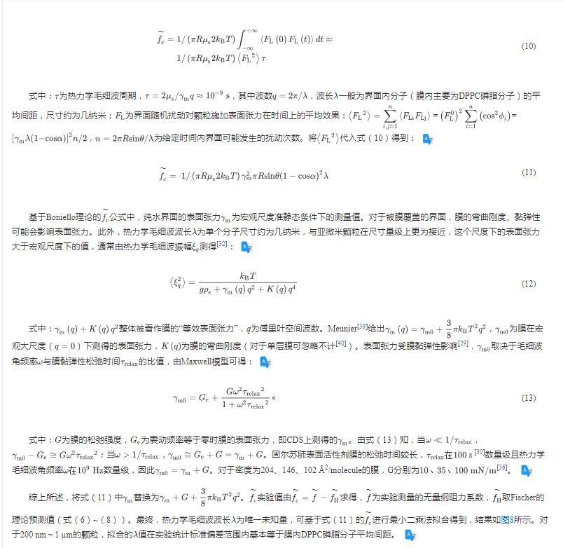 公式中,纯水界面的表面张力为宏观尺度准静态条件下的测量值。对于被膜覆盖的界面,膜的弯曲刚度、黏弹性可能会影响表面张力。此外,热力学毛细波波长为单个分子尺寸约为几纳米,与亚微米颗粒在尺寸量级上更为接近,这个尺度下的表面张力大于宏观尺度下的值,通常由热力学毛细波振幅测得: