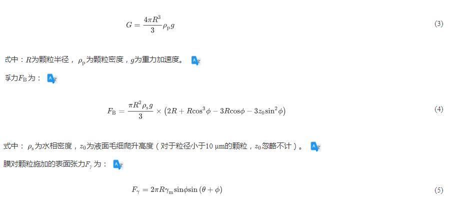 颗粒的水动力学阻力系数取决于颗粒在水相中的浸没程度(图5,以颗粒暴露在空气中的高度d表示)。颗粒的平衡位置取决于重力、浮力及膜施加的表面张力。重力G为: