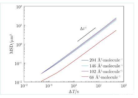 在LE相表面均匀的膜上,均方位移MSD随时间间隔Δt线性增长(图4),阻力系数由爱因斯坦关系