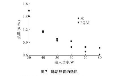 结果表明在100W的加热功率下,PQAI脉动热管的热阻比纯水脉动热管降低了20.8%。综上所述,以PQAI水溶液作为工质并经氧乙炔正火处理的脉动热管表现出较好的传热性能。